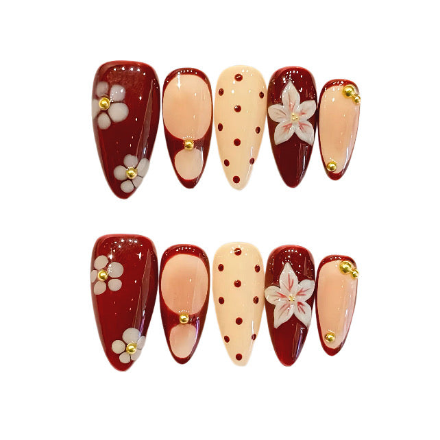These nails are beautiful, but I had 2 issues with them within the first 12 hours of wear. When I initially received them, I noticed a flower petal on the thumb nail was lifted and not set down on the nail. I glued the nails on, and at some point that lifted petal on that flower broke off. About 12 hours after gluing them on, the nail in my ring finger broke. I ended up filing them down a little bit so it wouldn’t be as noticeable. I do still love the nails, and I still think they look beautiful. I do wish they hadn’t gotten damaged so quickly. I will still be wearing them hopefully at least 2 weeks. It’s the first time I’ve had any issues with Hanakoko nails, (and I’ve bought at least 20 sets), so I’ll still be wearing Hanakoko nails in the future.