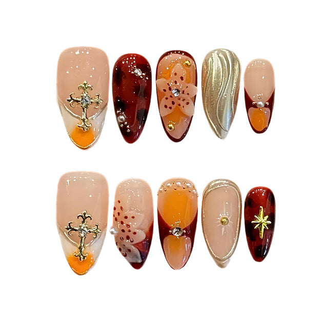- Semi-handpainted press-on, pre-painted pigments with nail artists' refinement