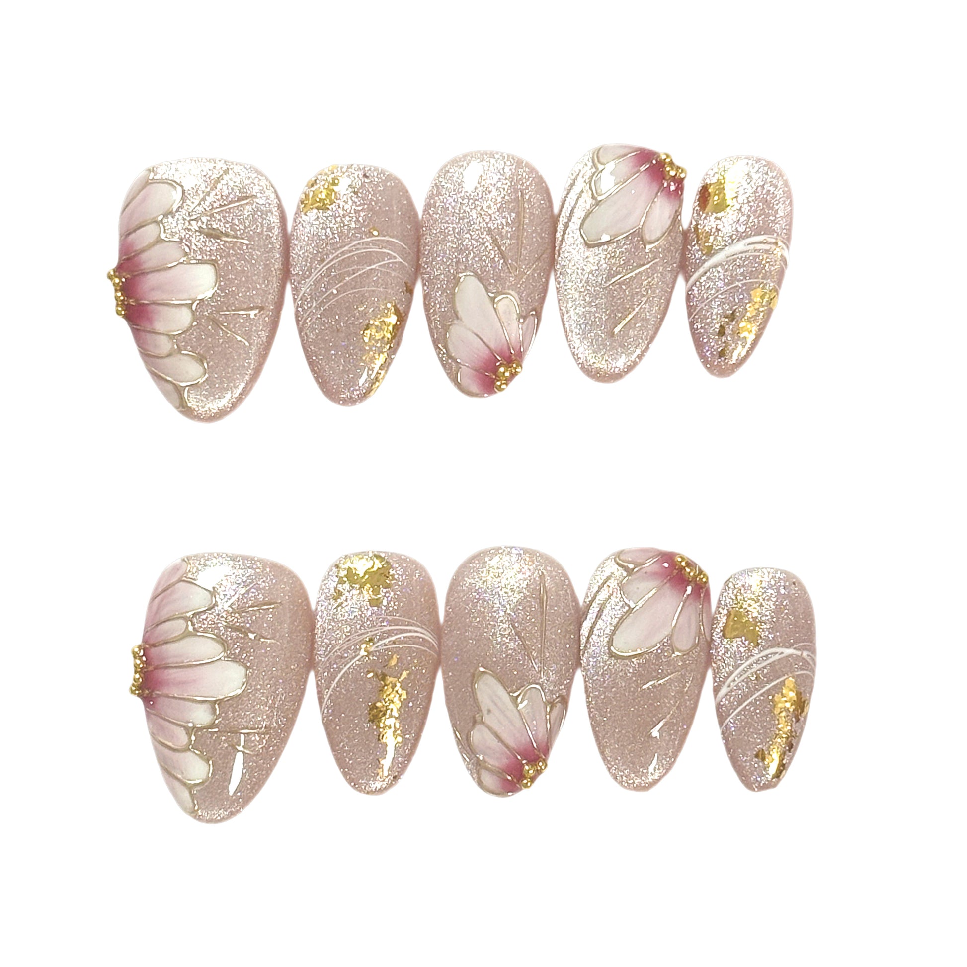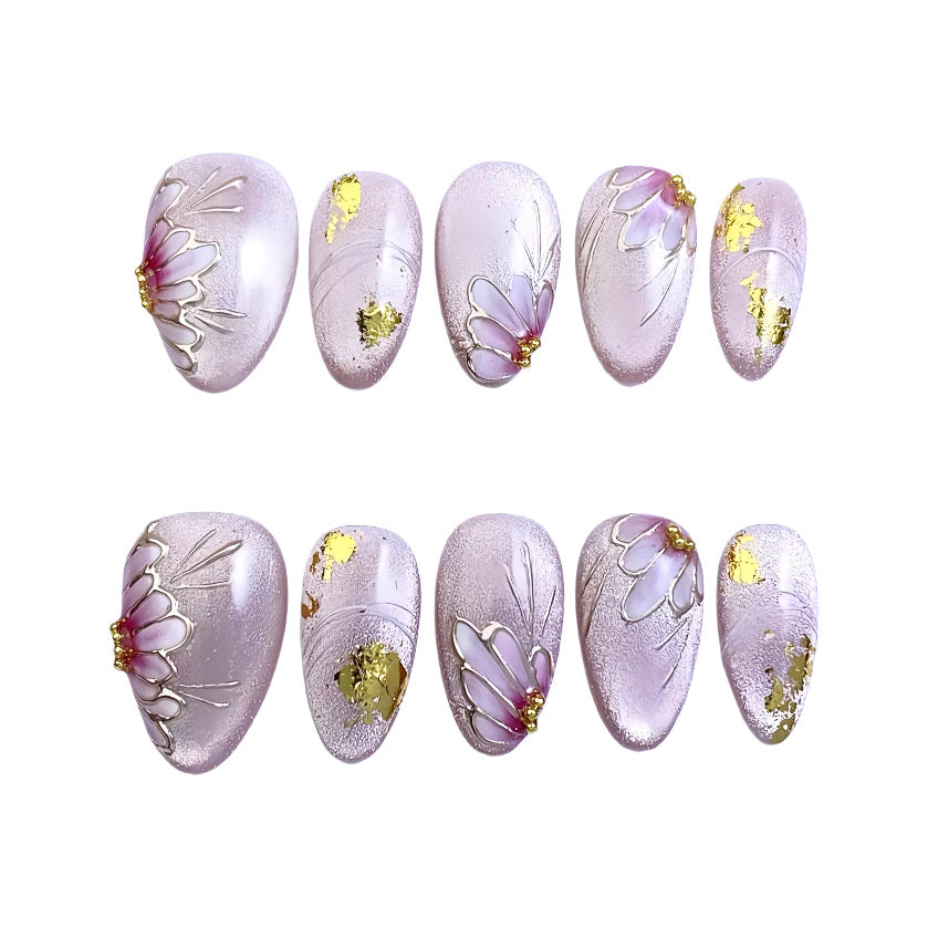 - Semi-handpainted press-on, pre-painted pigments with nail artists' refinement